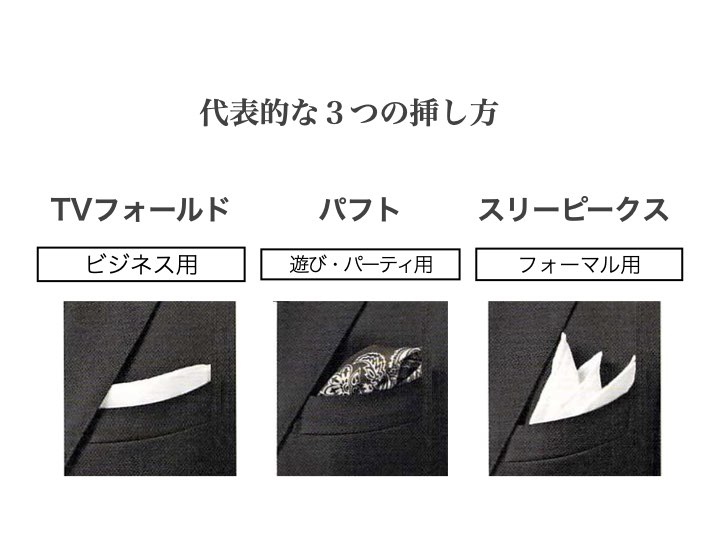 覚えておいた方がいい「挿し方」として代表的な3種類とそのTPOをお伝えします。