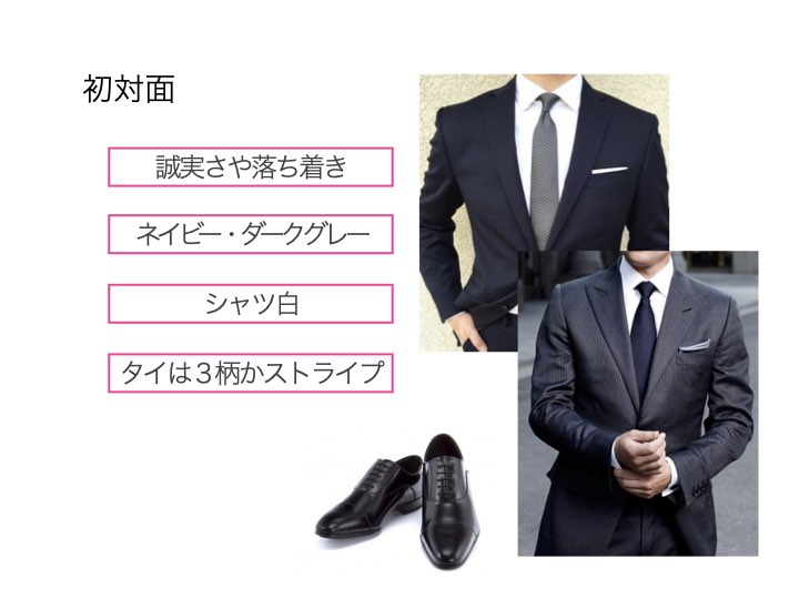 ですから、少々硬く見えても、ビジネスフォーマルに近い感覚のコーディネートで臨むことをおすすめします。