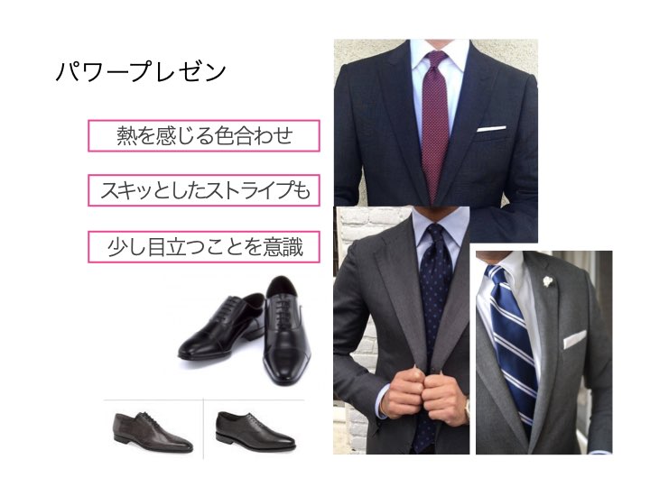 パワープレゼンでは「存在感」を演出したいものです。その存在感が「熱意」であれば、ネクタイは暖色系、特に赤やオレンジなどが配されたものが伝えやすいでしょう。また「知的さ」や「クリエイティビティ」を出したいならブルーやネイビーを効かせた、潔さがありながら「計算された」と見えるようなVゾーンを作りたいものです。