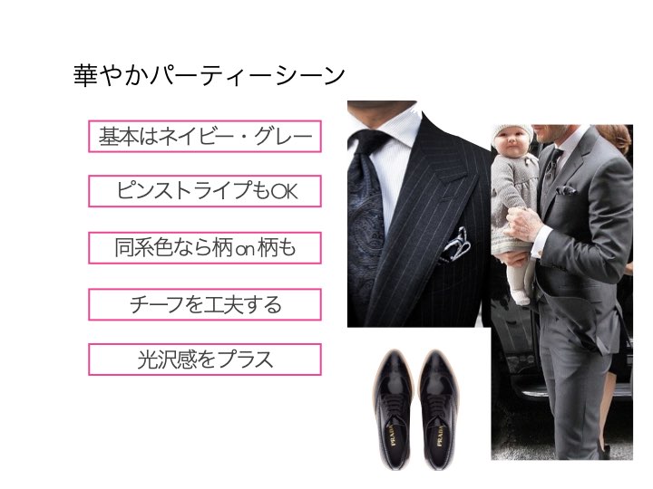 あなたがキャリアのあるビジネスパーソンやポジションのあるエグゼクティブであれば、パーティや食事など華やかなシーンでも、ダークスーツを主体にしたコーディネートが良いでしょう。ただし、初対面のときなどの謹厳実直な雰囲気ではなく、華やかさや柔らかさは演出しましょう。