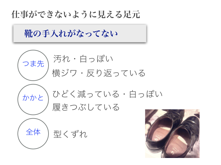 靴の手入れが悪く、甲にシワが入ったり甲が反り返っている状態の靴は身だしなみができていない印象、自分の身の回りをマネージできない印象があります。