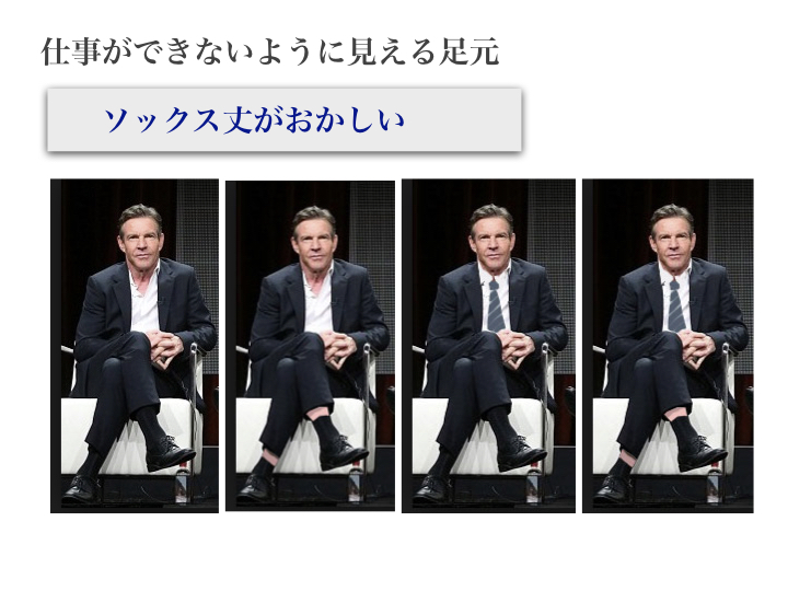 次にソックスの丈です。洋服国では「スネの素肌を見せる」ことは最も嫌われる行為であり「身だしなみができていない」とみなされます。特にスーツスタイルの時に、足だけ素肌がのぞくような着方は「大人の常識がない」と見られ、ビジネス能力まで軽く見られかねません。