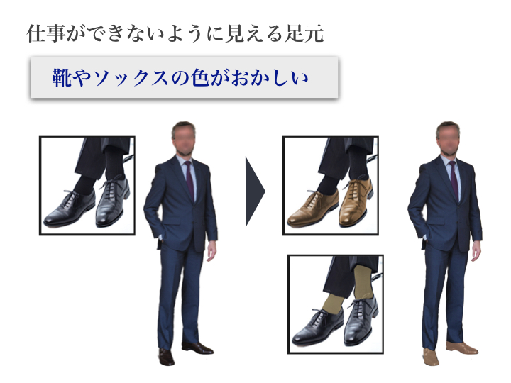 まず、靴やソックスの色の選択には気をつけてください。