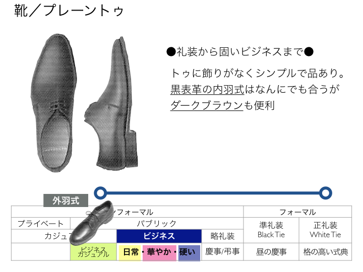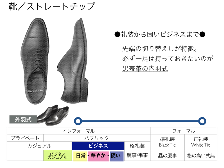 この分け方は「インフォーマル」の場合です。フォーマルは少し違う靴も必要な場合があります。ただし、黒表革のストレートチップやプレーントゥはよほど制限のあるフォーマルシーン以外は合わせることができますので、ノーマルなものを一足もっておくことは便利です。