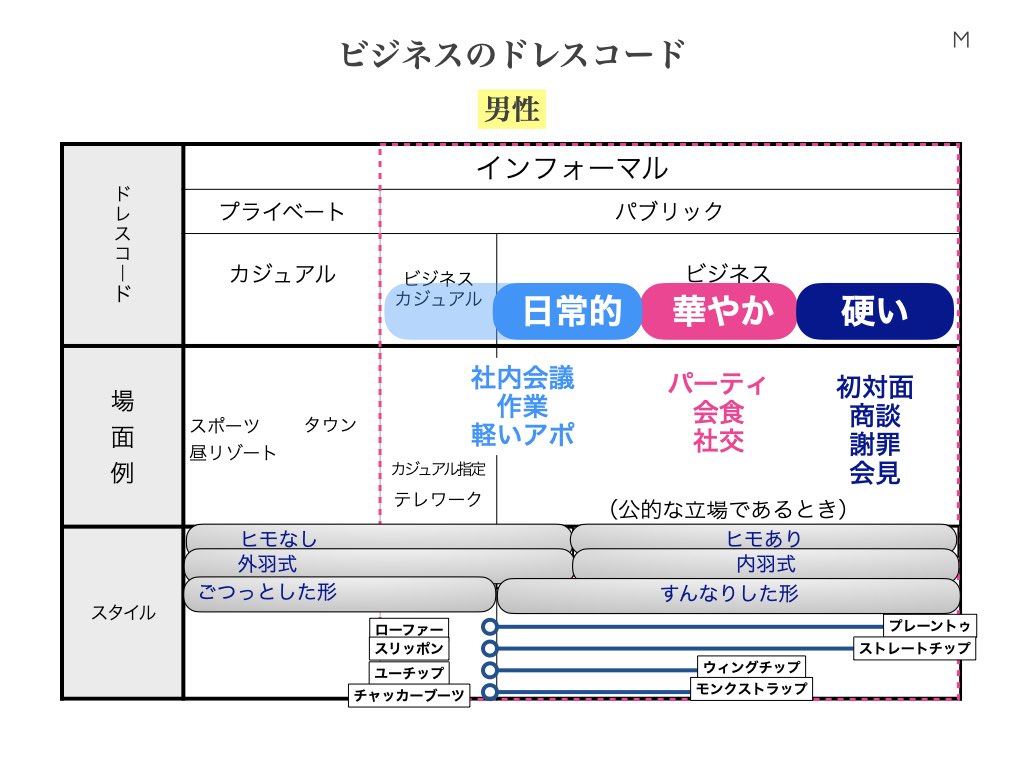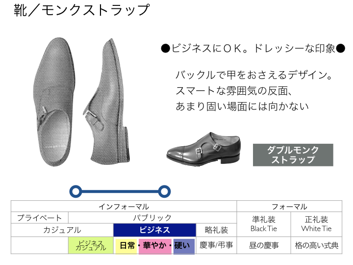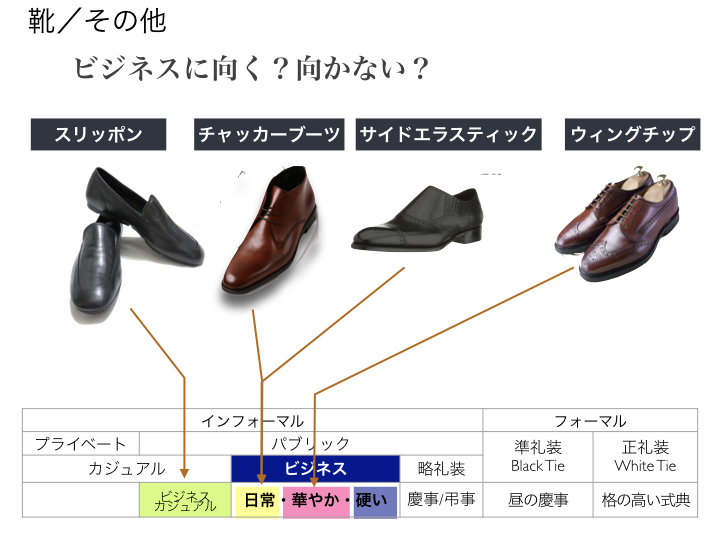 それぞれの靴の説明と、ドレスコード表で見る「ふさわしい場面」をご覧ください。