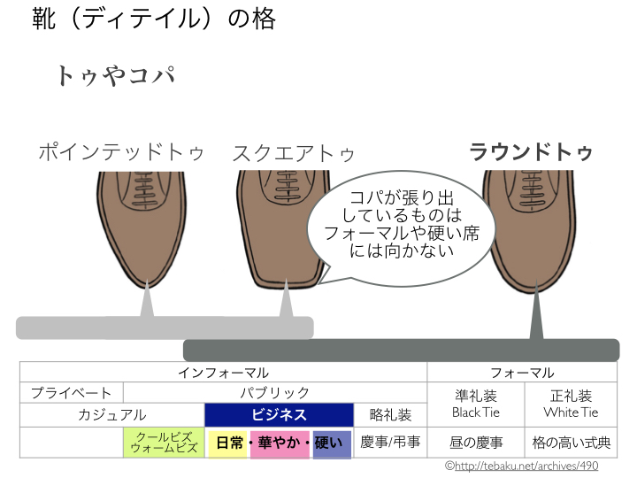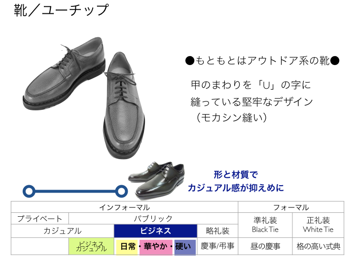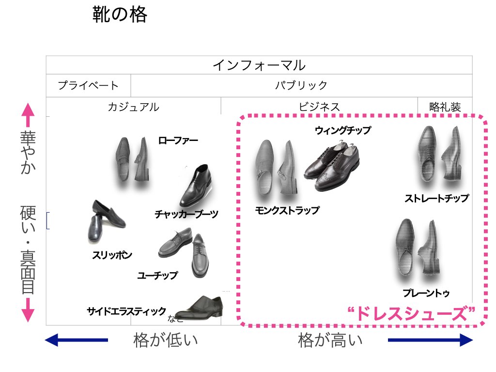 上の図で「格が高い」はビジネスフォーマルの場面やきちんとした場所に履いて行っても差し支えないこと、「格が低い」はカジュアル寄りの靴で、ビジネスフォーマルや気を使うべき場所には向かないこととご理解ください。