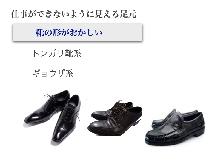 足元が奇妙なフォルムであると、それだけでスーツスタイルが野暮ったくなり、また社会人としてのセンスが疑わしいような印象となってしまいます。「おかしい形の靴」を履いてはいけません。念の為、よくある「おかしい形の靴」をご紹介します。