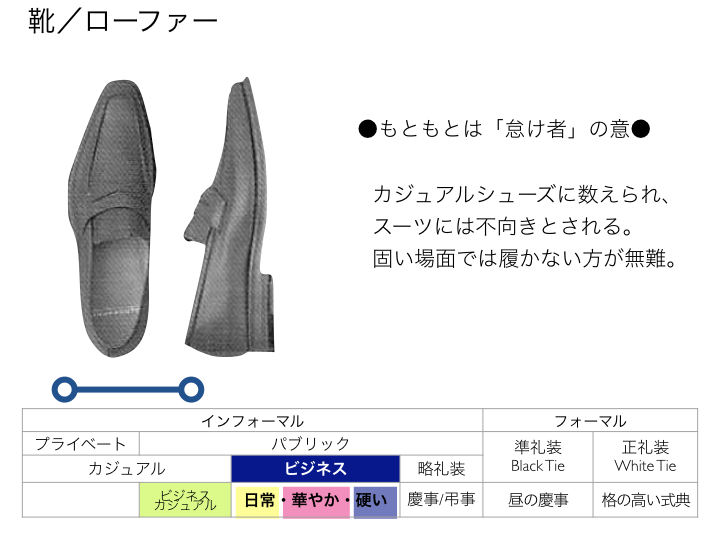 ある英国人は「日本にはスーツにローファーを履いているビジネスパーソンがよくいるけど、私たちの目から見ると”晴れ着に下駄”を履いているような奇妙な格好に見える」と発言していました。靴の選択をおろそかにして、印象を悪くしたり侮られたりしないようにしたいものです。