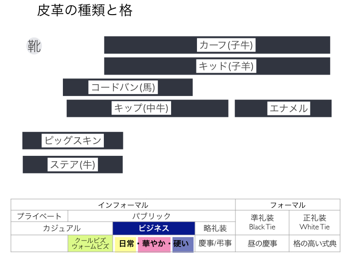 皮革の種類もいくつかあり、何を使っているかによって「格」が変わります。希少な革で価格が高いものでも、格からすると低いということはよくあります(着物で言えば大島紬は価格が高いものが多いですが格の高い席ではふさわしく無いことと同じです)。