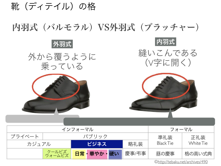 よく出てくるのは「内羽式」「外羽式」です。「内羽式」はドレスシューズに、「外羽式」はカジュアルシューズになります。ひもがついている靴でも、外羽式の靴をビジネススーツに合わせるのは間違った合わせ方です。また、カジュアル目なセットアップやジャケット&パンツに内羽式の靴は靴だけが妙に上品に浮いてしまい、バランスの悪いコーディネートになりがちです。