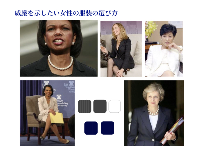 女性も政治家や経済人などパワフルにコーディネートしたい人は、色数を抑え、使っても同系色でまとめて、極めてスッキリした装いになっています。