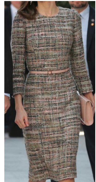 ●ツイードに使われた糸の一色を抜き出して、その色とベルト、バッグ、靴を揃えたコーディネート。ソフトで洗練された色使い。