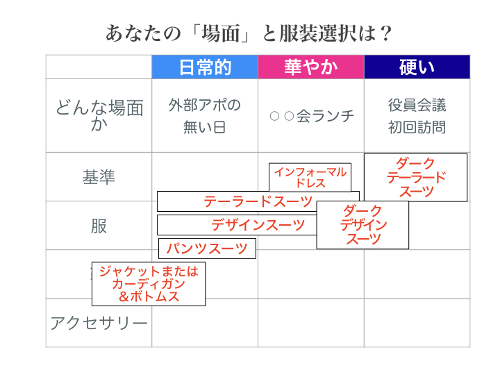 さて、ここまで何度もでてきた、硬い 華やか 日常的 の3つのゾーン、あなたの実生活に落とし込むと、それぞれどんな場面があてはまりますか?